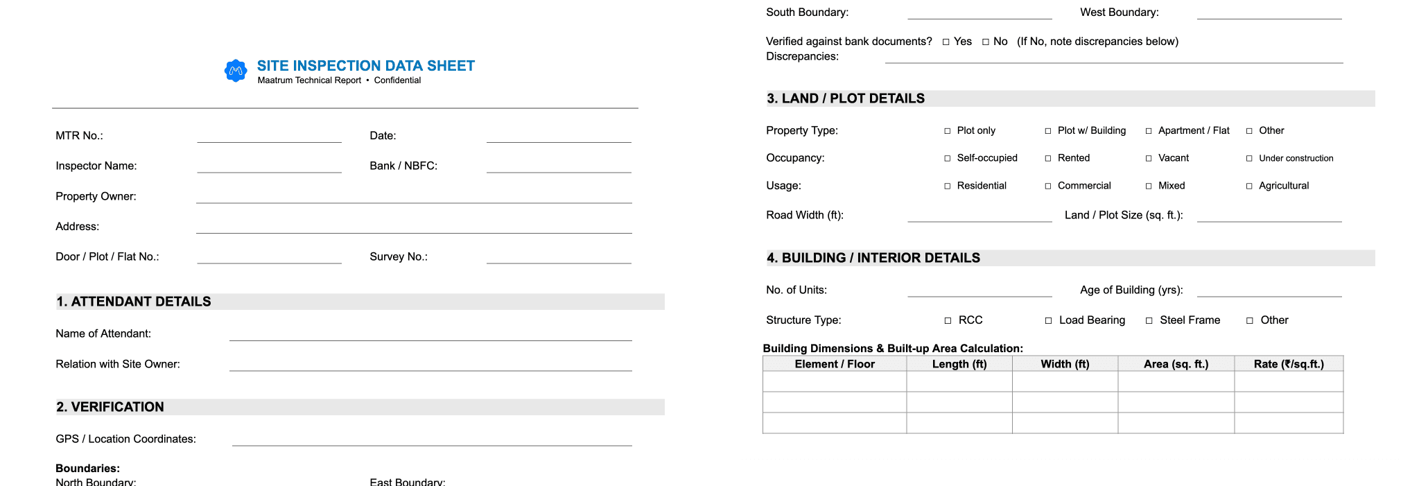 Maatrum is an India-based full-stack legal verification and property valuation service provider for banks and NBFCs. Their civil site inspectors physically visit properties across the country — from dense urban lanes in cities to remote rural plots — to collect the data that ultimately becomes a legally binding valuation report for mortgage approvals and loan processing.