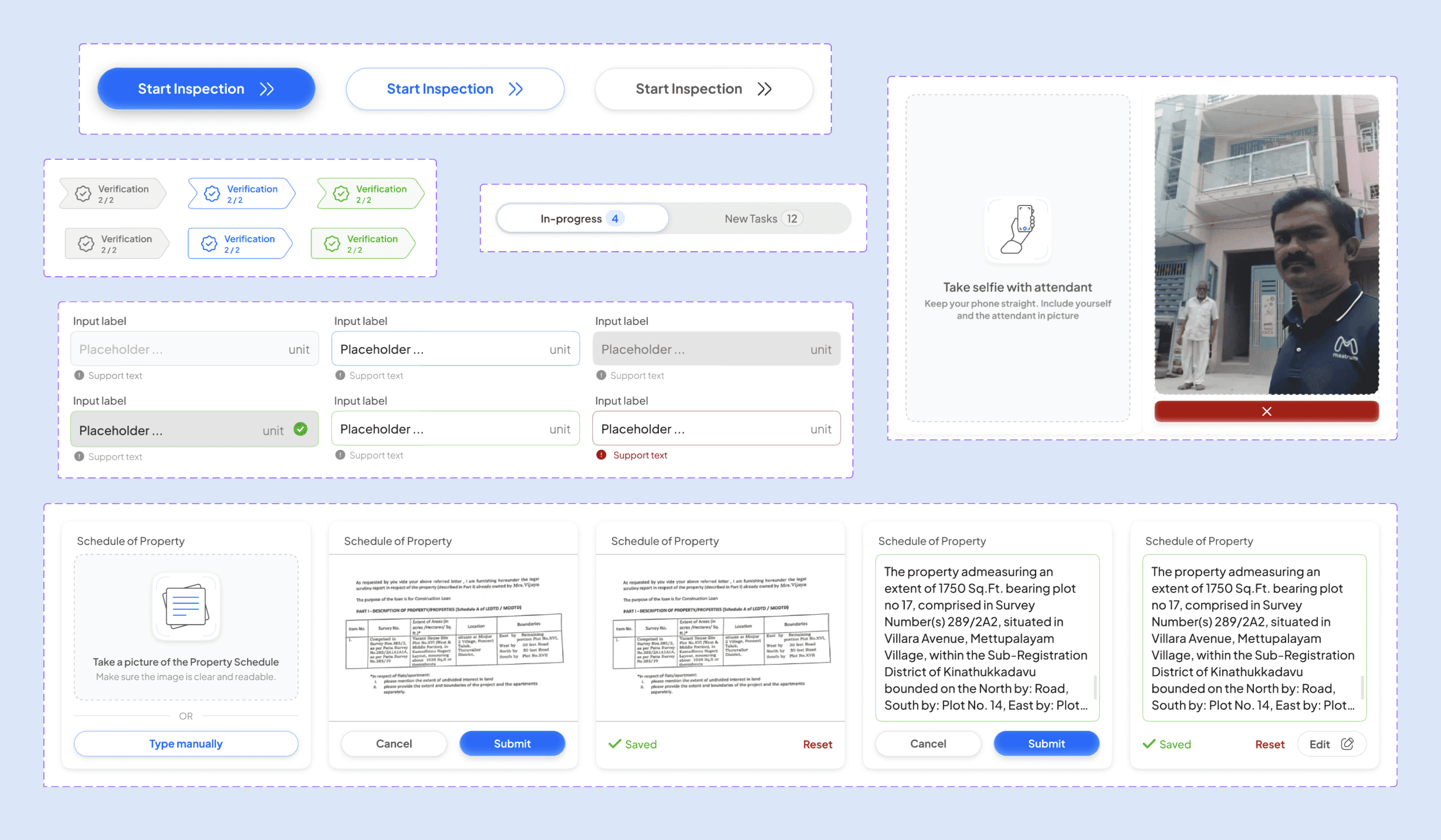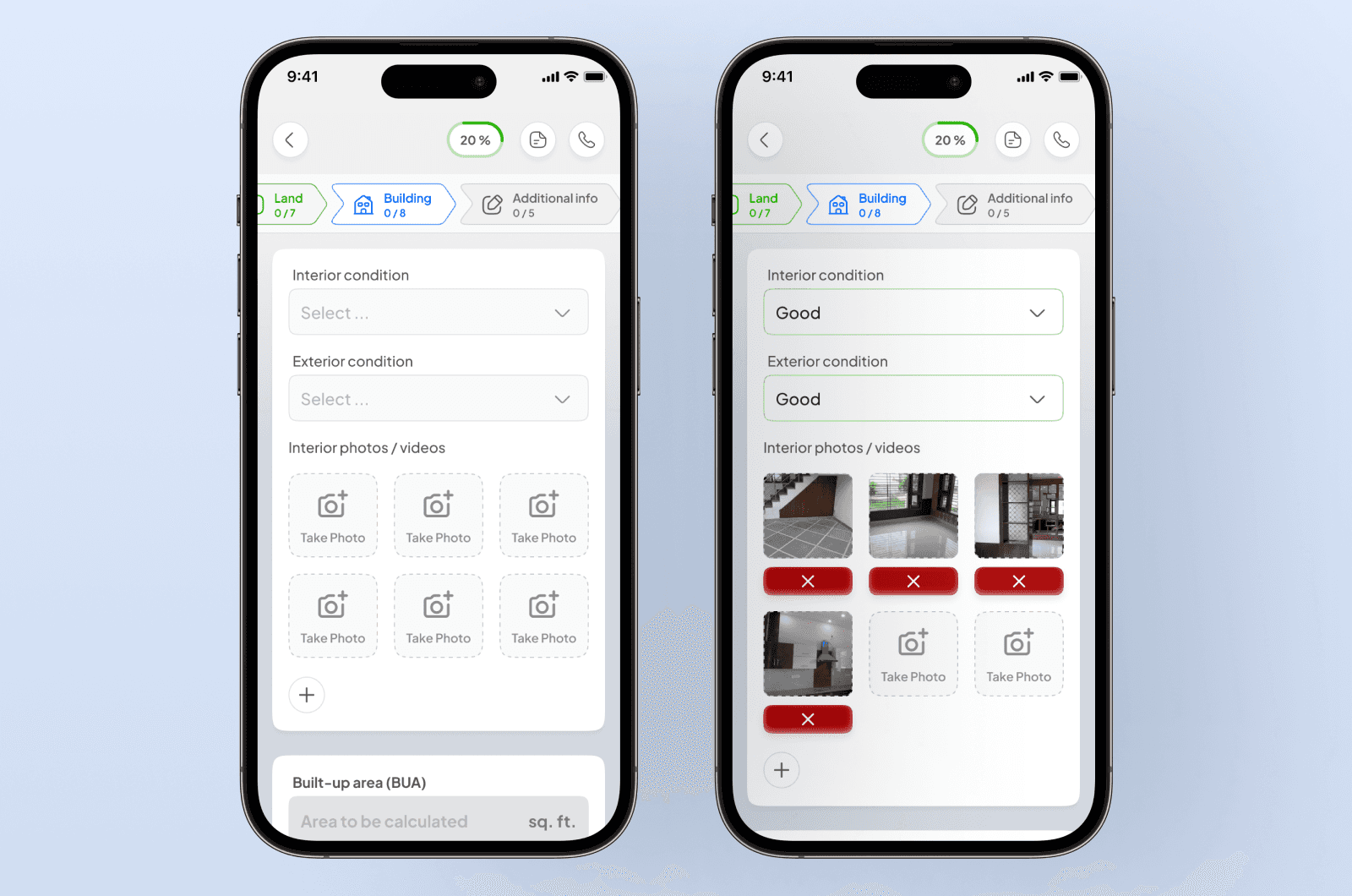 On paper, inspectors took photos freely and sent them all via WhatsApp without structure. I designed labelled photo slots directly within the flow — "Front side," "Left side," "Right side" for land, six dedicated slots for interiors. Each slot uses a one-tap camera trigger with a clear placeholder, so the inspector knows exactly which photo they've taken and which they haven't.