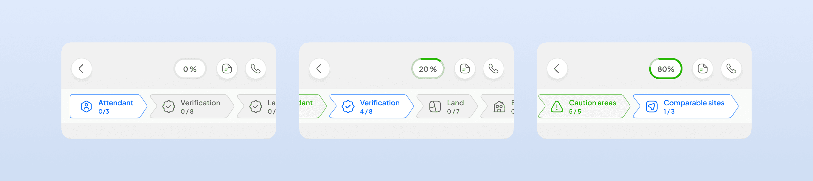 Consistent status indicators: green checkmarks for verified fields, percentage badges in the stepper, and the large green success modal on completion. These give inspectors — and the back-office — immediate visual confirmation of data integrity at every stage.