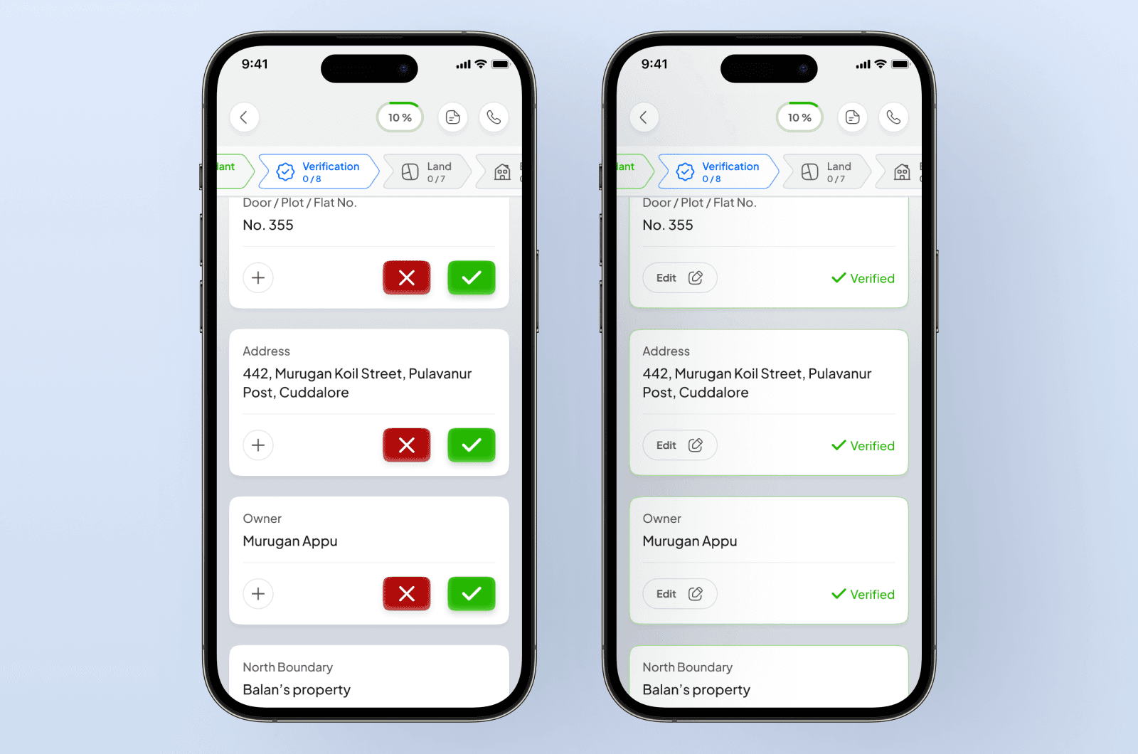 For fields like boundaries, address, and owner name, the inspector isn't discovering information — they're verifying it against bank records. I designed these fields to arrive pre-populated with official document data.