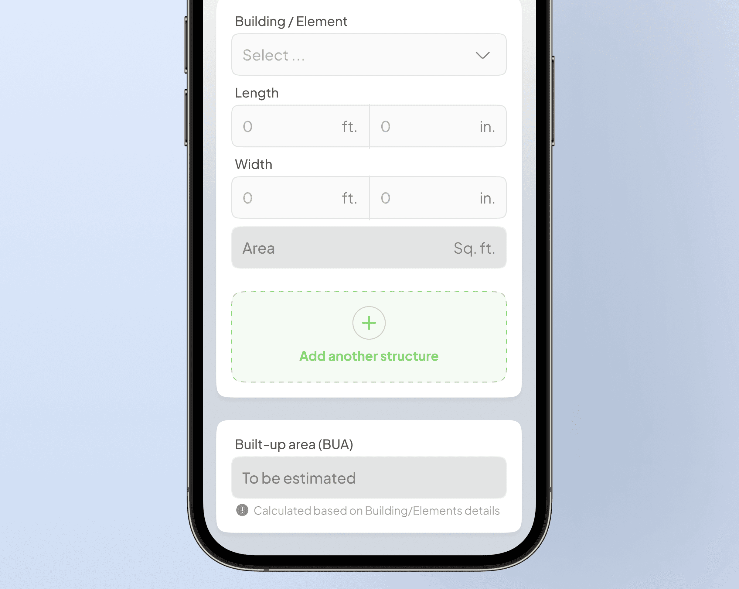 I replaced the single "BUA" input field with dimensional inputs for length and width, with the app computing the square footage automatically. A "Calculated based on Building/Elements details" label gives the inspector confidence that the math is handled. They measure; the app calculates.