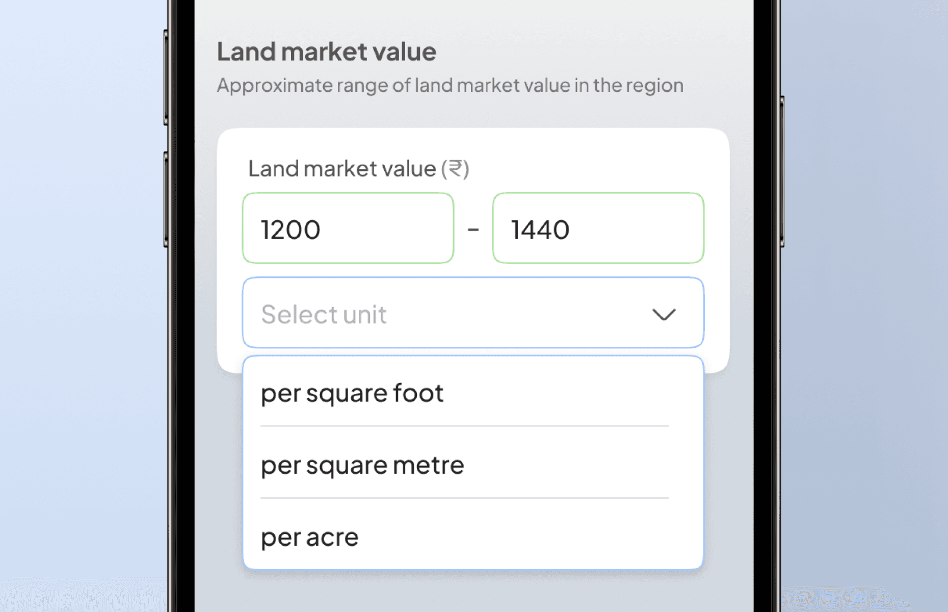 Different parts of India use different units — square feet, square yards, acres, cents. On paper, inspectors simply wrote the unitThe app needed to accommodate this flexibility.